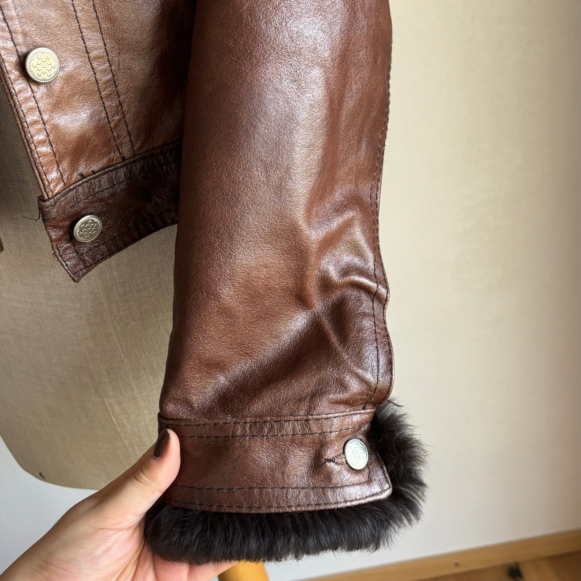 Brown Leather Fur Trim Jacket (S)